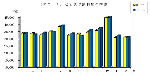 調査対象14社の2月の宅配便貨物の取り扱い個数は、約3億619万4,000個で、前月比約1,380万1,000個減少したため、前月比95.7%(季節調整済み95.1%)となり、前年同月との比較では、約54万4,000個減少したため、前年同月比99.8%の実績であった。