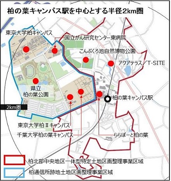 「柏の葉キャンパス」駅を中心とする半径2km圏の柏の葉エリアには、東京大学、千葉大学、国立がん研究センター東病院などの拠点施設が存在している。近年は東京大学柏Ⅱキャンパスに、国立研究開発法人産業技術総合研究所柏センターが設立される等、研究機関の進出が進んでいる。