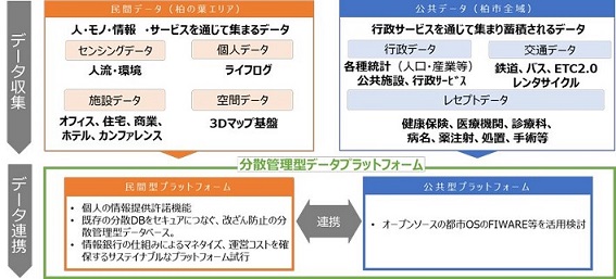 ●柏の葉エリア地図(上)、スマートシティのデータプラットフォームの概要(下)