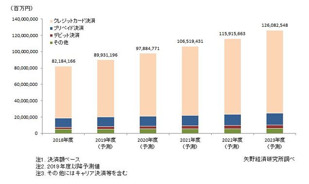 一方、2023年度の国内キャッシュレス決済市場規模は約126兆円まで拡大すると予測。クレジットカード決済を中心にプリペイド決済やデビット決済の拡大が進むとみる。