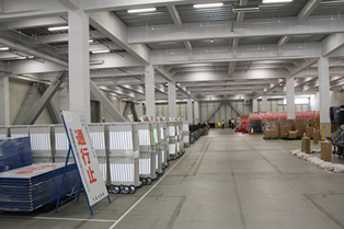 ●大阪サミット警備の物流サポートで使用された保管スペース(上)と機材搬出作業の様子(下)