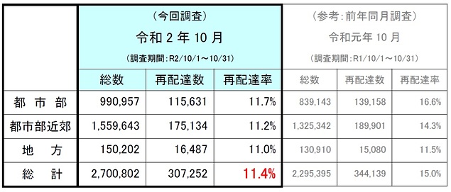国土交通省は12月11日、令和2年10月の宅配便再配達率は約11.4%になったと発表した。