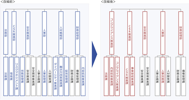 法令遵守体制を強化するためコンプライアンス推進部を新設し、法務部を統合する。さらにコンプライアンス推進課を新設し、コンプライアンス重視の体制を強化する。また、内部統制推進課を財務経理部から移管することで、内部統制全般の統括管理と業務プロセスの改善を強化する。