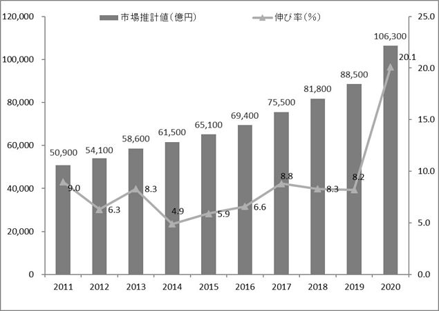 コロナ禍の購入手段として活用されたこともあり、調査を開始した1982年度以来初の20%以上の伸び率となった。過去10年の平均成長率は8.7%で、マイナス成長を記録した1998年度以来22年連続で増加している。