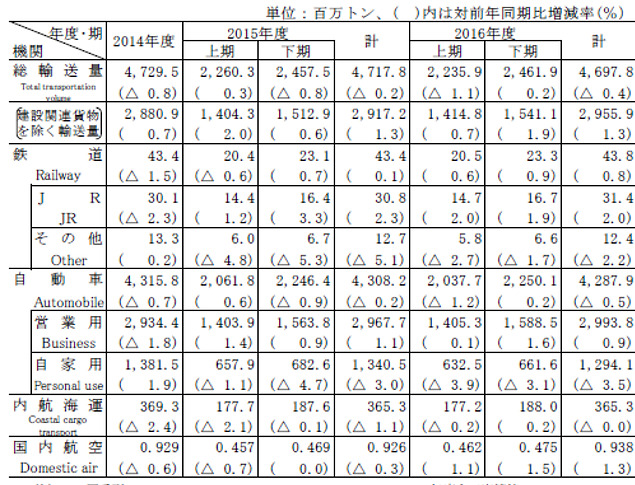 2015年度に増加した国内貨物輸送は13億510万t(同3.2%増)となった消費関連貨物で、とくに「日用品」「食料工業品」が牽引、一方、生活関連貨物は「一般機械」や「化学工業品」が堅調に推移する反面、「自動車」「鉄鋼」「石油製品」が減少し15億6,770万t(同0.3%減)、建設関連貨物は「民間住宅」や「非住宅部門」の建設に持ち直しの動きがあったが、公共投資が落ち込み18億60万t(同2.6%減)と減少した。