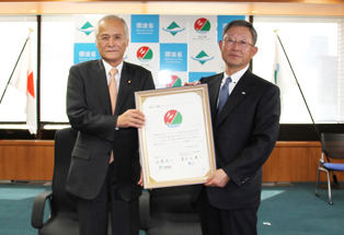 ●山本公一環境大臣(左)とSGホールディングス代表取締役会長栗和田榮一氏(右)