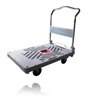 ・台車が使用される公共や施設内、住居に配慮するため、車輪は40dB以下の静かなキャスターを開発。フレームも肉抜きすることで車輪とフレームの共鳴音が抜けて静音性を実現した。ハンドルを折りたたむ際に"フレーム"と"ハンドル"間で生じる打撃音もフレームにハンドルをキャッチするくぼみとエラストマーで軽減した。車輪もマーキング跡が目立ちにくいグレー車輪を採用している。