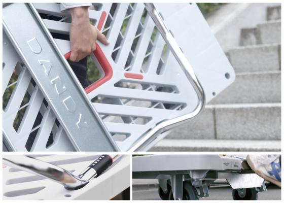 同シリーズは台車という既成概念を超えた「愛車」と呼べる美しくも力強いフォルムに加え、毎日台車を使用する配達員等のプロも喜ぶ静音性や軽量化、ハンドリング性能といった高機能、車輪が工具なしで1分以内に外すことができる革新的機能を実現。車のトランクでも邪魔にならないため、キャンプや釣り等のアウトドア用途にも適しており、頑丈でありながら持ち運びやすさも大きな特徴となっている。