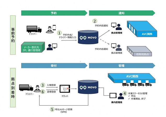 等が、パソコン・タブレット・携帯電話(ガラケー/スマホ両方に対応)等の様々なデバイスを活用してMOVOプラットフォームにアクセスできるようになる。大口チャーター便は配送管理者が主体となってパソコンから予約。路線便はドライバーが適宜到着予定時刻を考えながら携帯電話から予約する等、ユーザーによって運用を使い分けることが可能であり、納品予約から現場でのコミュニケーションまでの一連の業務を一気通貫でオンライン化することを目指す。