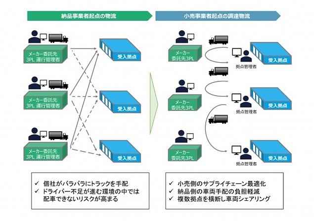 今回アスクルは、MOVOバース管理ソリューションの導入にあたり、Hacobuが大手GMSを含む複数の小売事業者や、納品側の大手消費財メーカー等に対し、同システムを導入・運用した実績を有することも評価。HacobuはMOVOバース管理ソリューションを、サプライチェーンの上流から下流の様々な物流拠点に一気通貫で導入していくことを目指している(例:メーカー調達物流、工場~在庫保管倉庫/センター、小売・卸共配センター)。まず小売サイドにおいて、複数の事業者で共通システムが使われることで、予約する側(納品事業者側の配送管理者やドライバー)が複数のシステムを使う煩雑さを回避される。またMOVOバース管理ソリューションは、入出荷両方の業務に活用できるため、納品事業者は納品先の予約と自社拠点(工場/倉庫)における入出荷を、同じ環境で行うことができる。