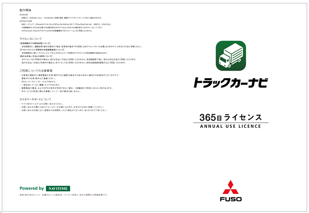 購入客には「トラックカーナビ」アプリを365日間使用できるシリアルナンバーを記載した冊子を贈呈。自身が所有するスマートフォンに同アプリをダウンロードし、シリアルナンバーを入力して利用する。