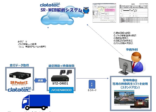 「SR PocketⅡ」で取得した走行データを「STZ-DR01」に送り、データ・テックのクラウドサービス「SR-WEB解析システム」へ走行データをアップする。また、事故相当レベルの衝撃があった際にはドライブレコーダで取れた画像データをSR-WEB解析システムに送信する(システム全体イメージ)。