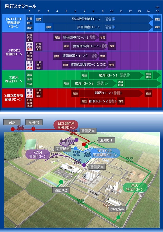 今回、福島ロボットテストフィールドとその周辺の900m×600mの範囲に離着陸場を8か所設置し、「災害調査」、「警備」、「物流」、「郵便」という4つの利用シーンを想定し、安全を確保しながら10機のドローンを15分程度の時間にわたって適切に飛行させた。運航管理統合機能は複数ドローンの飛行計画の調整および飛行中のリアルタイムでのドローン位置情報管理を、人の手を介さず自動的に実施した。