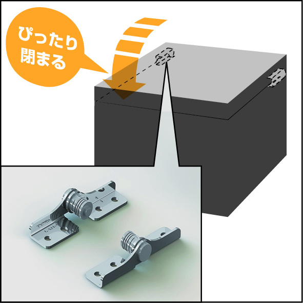 一般的なトルクヒンジを採用した開閉部は、スプリングバックにより浮いてしまい、しっかりと閉まりきらないことがある。きちんと閉めるには、保持部品(キャッチなど)を別途で設ける必要がある。