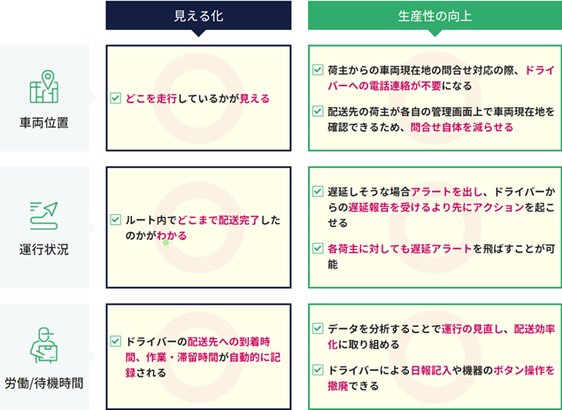 また、OBD給電型とシガー給電型は端末の取り付け工事を必要とせず、電池交換等の必要もないため、協力会社等、自社以外のトラック(傭車)にも導入が容易で、様々な車両の間で抜き差しして使用できる柔軟性が特徴となる。