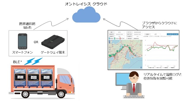 同社製温度ロガー「オントレイシスタグ」で取得したデータの一元管理が同プラットフォーム上で可能になるもの。これにより、輸送温度のリアルタイム監視と温度と位置情報のログデータ保管を実現し、温度管理が必要な医薬品や食料品等の輸送・保管時の品質向上に貢献する。