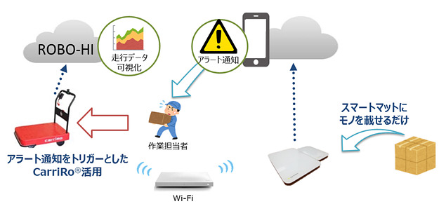 同実験では、自動運転向けクラウドサービス「ROBO-HI」を物流支援ロボット「CarriRo(キャリロ)」と連携させ、Wi-Fi経由でキャリロの運用状況の可視化を行うとともに、荷重計測のできるIoT重量計スマートマット※を活用した物流倉庫内ネットワーク環境の提供、ソリューションの高機能化を図る。