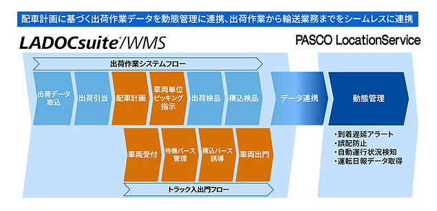 今回の新バージョンは、空間情報(地図情報/道路ネットワーク情報)を活用し、物流分野での地図ソリューションを開発・提供する(株)パスコのクラウド型動態管理システム「PLS(PASCO LocationService)」の車両位置情報と連携し、庫内業務から輸送業務までをシームレスにつなぐことで、物流現場の管理負荷軽減を図ることができるというもの。