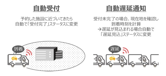 今回のサービス連携では、トラック簿で予約したトラックにCariotの情報を登録することで、当該トラックが目的の施設に近づいた際に自動で受付が行われるほか、到着が予約時刻を過ぎる場合には自動で施設側に遅延が通知されるため、ドライバーの作業負荷を軽減できる。今回のサービス連携は2020年上半期の予定。