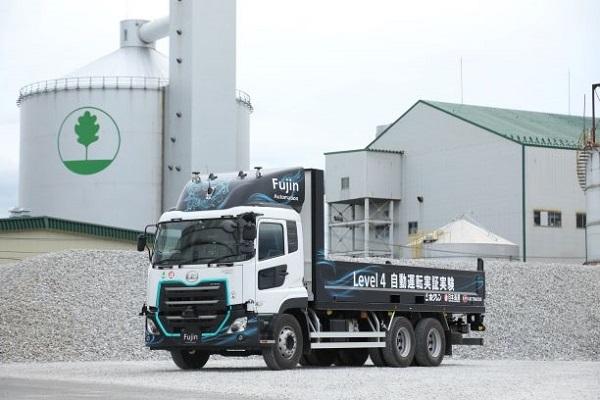 同実験では、UDトラックスの大型トラック「クオン」をベースに開発された車両を使い、RTK-GPS(リアルタイムキネマティック全地球測位システム)や3D-LiDAR、ミリ波レーダ、操舵アクチュエータなどの自動運転技術を駆使し、約1.3kmの運搬ルート(公道、舗装道路、未舗装道路を含む)を時速20kmで自動走行した。