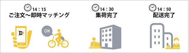 14:15ご注文 ~ 即時マッチング ~ 14:30同社にて集荷完了 ~ 14:50ホテルへの配送完了