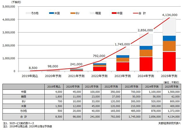 5Gは2019年4月から韓国・米国で商用サービスが開始されている。2021年から順次世界各国の通信事業者による5Gサービスが開始され、普及が進む見通し。4Gで早期に普及が進んだ米国と中国では、5Gについても早期に普及する可能性が高い。