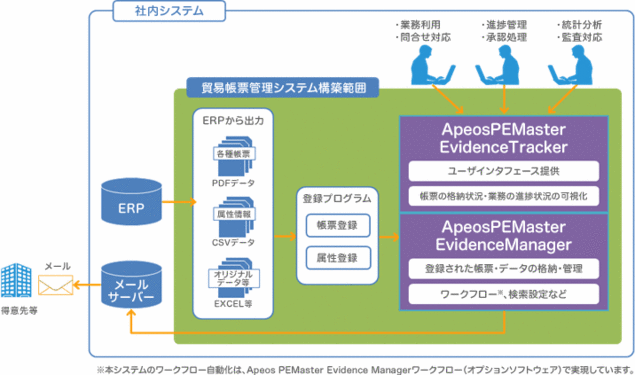 本システムは、これまで部門毎に異なるフォームで作成されていた貿易帳票類の標準化と電子化、販売・出荷などのデータを一元管理する統合データベースとの連携など、業務プロセスの標準化による効率化、業務品質とセキュリティーの向上を推進する貿易帳票管理システム。ERP導入による統合データベース構築のタイミングにあわせ、2013年3月より輸出業務で本システムを稼働。輸出業務の効率化やコスト削減効果をふまえ、同年11月より輸入業務においても本システムの活用を開始した。本システムにより作成・管理される輸出・輸入業務に関する貿易帳票類、そしてその管理プロセスの運用面や法的対応については大阪国税局・神戸税関の承認を得ており、電子帳簿保存法に対応したシステムだ。