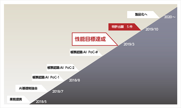 一般的なAI開発プロジェクトでは、初期のPoC(概念実証)段階で頓挫してしまうことも少なくないと言われている。今回のプロジェクトでも初回PoCには失敗したものの、その後失敗原因の精査やAIモデルの設計方針を転換するなど、粘り強く開発を継続した結果、帳票構造の認識AIにおいて目標の認識率を達成できた。これはエンジニアの技術力だけでなく、両社の経営層がAIの重要性を深く理解してマネージメントを推進したことも大きな要因となった。