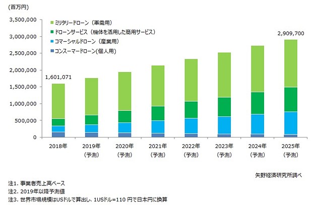 (株)矢野経済研究所は2月20日、2018年のドローン世界市場規模が軍用需要と民生需要(産業用機体、個人用[ホビー]機体、機体を活用した商用サービス)の合計で約1.6兆円(1米ドル=110円で換算)となり、2020年~2025年における年平均成長率(CAGR)は8.3%で成長するとの見通しを発表した。