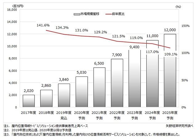 (株)矢野経済研究所は2月14日、国内の屋内位置情報ソリューション市場(事業者売上高ベース)について、2017年度に20億円程度とさほど大きくない市場だったのに対して、2018年度は前年度比41.6%増の28億6,000万円まで成長したと発表した。