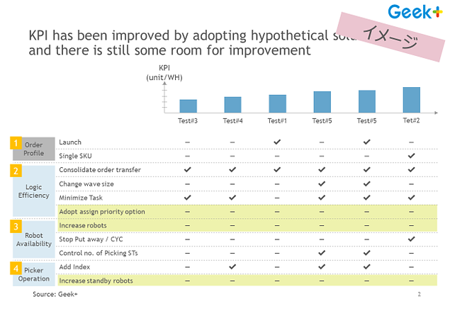 同社はグローバルの物流ロボット業界に先駆けて、自社でコンサルティング事業部を立ち上げた(なお、同事業はギークプラスグループでも、他地域に対して、日本が先行して開始)。新型コロナウイルスの影響によるEC出荷量の増加を受け、ロボットの生産性を一段引き上げたいとの要望が高まりつつあり、導入後のさらなる付加価値向上を目指す。特徴として、分析に留まらず、メーカーである優位性を生かしながら、必要に応じてロジックの変更や追加開発も含めた、最適なカスタマイズを提案。また、コンサルティング期間中は、専任コンサルタントをアサインし、分析~提案〜実行〜検証の一連の流れを、顧客をサポートしながら実施する。