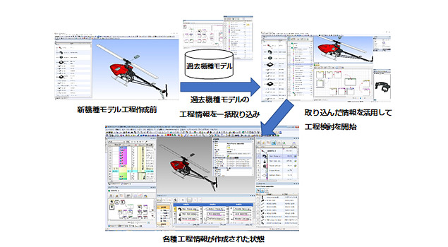 「VPS Standard」「VPS Manufacturing」では、BOPを過去機種モデルから新機種モデルに流用することが可能。これにより、「VPS」上での工程順序や工程情報を従来比1/2の時間で作成可能(注1)になる。新機種モデルや別工場での同製品の工程計画時等に、工程検討を効率的に短時間で実施できる。