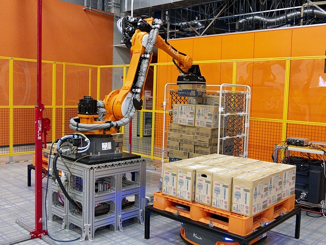 ・知能ロボットによるケースのパレット・かご車・カートラックへの積み付け