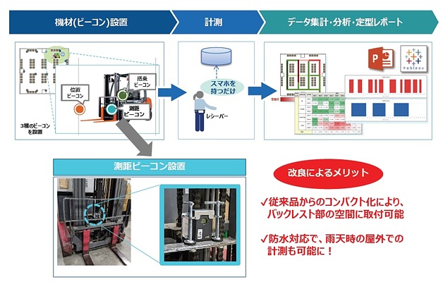 今回アプリックスと以下の点を改良し、積載センサとビーコンを一体化した「測距ビーコン」を開発。これにより、従来取り付けのできなかった場所にも取り付けが可能となり、ほとんどの型のフォークリフトに対応し、屋外での計測も可能となった。