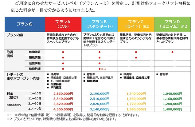 2018年に開始した「ろじたんフォーク」は倉庫内の情報をデータ化する「ろじたん」の関連サービスで、倉庫・工場内でのフォークリフトの稼働状況を可視化し、本当に必要なフォークリフトの台数を算出する。倉庫内に位置ビーコン、フォークリフトに測距ビーコンと搭乗ビーコンを設置し、そこから得られるデータを収集・分析することで、フォークリフトの稼働率や積載率(空走行の比率)、作業導線等を把握し、フォークリフトの適正台数の算出と削減の合理化検討に役立てることができるほか、作業動線やレイアウトの見直し等による業務改善へつなげることができる。