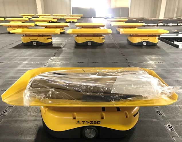 本邦初の「ビッグフラップ型t-Sort」導⼊先はゴールドウイングループの物流作業を受託する東砺倉庫(株)の富⼭県の在庫型物流センター(DC)となった。従来⼈の⼿仕分けにより⾏っていた⼤型リュックサックをはじめとする多様な形状のアパレル・スポーツ⽤品を各店舗先へ仕分けに「ビッグフラップ型t-Sort」を活⽤することで作業を⾃動化し、従来⽐30%以上の効率化を実現した。