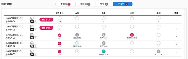 受付が完了し、各拠点への割り当てが必要なカードや割当後の拠点ごとの作業進捗の様子を、一覧画面で確認できる。