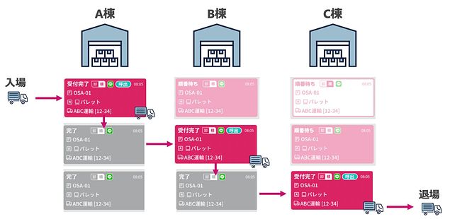 従来複数箇所での作業が発生する拠点では、ドライバーが都度受付をする手間が生じていたほか、各拠点の庫内作業者には次に来るトラックの情報がないため、事前の準備が困難なことに加え、複数拠点全体の管理者は各拠点の進捗が把握できず適切な差配がしにくいといった課題を抱えており、スムーズな業務を実行しづらい環境だった。