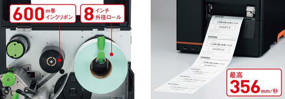 従来機種(※1)と比べて約2倍向上した業界最速クラス356mm/秒(※2,3)の印刷速度を実現。さらに8インチ外径ロールや600m巻インクリボンにも対応し、大量印刷に適した少ない交換頻度で作業効率にも貢献する。