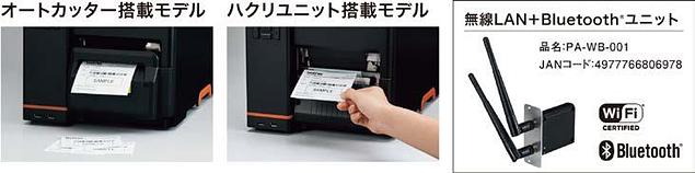 発行したラベルを自動でカットする「オートカッター搭載モデル」(※5)や、台紙からシールをはがす手間を省く「剥離ユニット搭載モデル」(※4)を用意した。また、オプションとして無線LANとBluetooth(※6)に対応するための「無線LAN+Bluetoothユニット」も用意しており、用途に合わせたカスタマイズが可能。