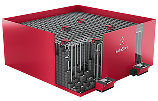 ●「AutoStore」とピースピッキングロボットの連携イメージ(上)、ロボットストレージシステム「AutoStore(オートストア)」(中)、ロボットピースピッキングシステム「RightPick(ライトピック)」(下)