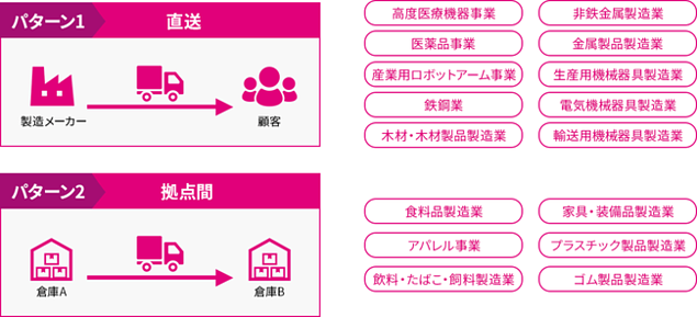 積み替えがなく、直送が中心の鉄鋼業や木材製品製造業等をはじめ、拠点間の配送が多い食料品製造業やアパレル業等でも活用可能