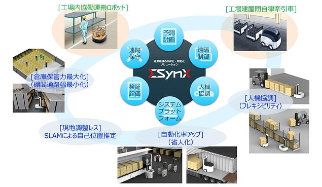 ΣSynXは「予測計画」「遠隔制御」「人機協調」「システムプラットフォーム」「検証評価」「遠隔保守」といったコア技術から構成されている。物流機器への適用例として、「予測計画」については複数のAGF(Automated Guided Forklift:自動運転フォークリフト)やAGV(Automated Guided Vehicle:無人搬送車)を効率的に差配する群制御(※2)等の行動計画技術、「人機協調」については人や物を検知し回避する技術や人と機械がコミュニケーションを取るための非言語ヒューマンインターフェース技術等が挙げられる。ΣSynXのコア技術は、それぞれ個別のパッケージ群「SynX-Suite」としてモジュール展開を計画しており、これらの技術パッケージを“Powered by ΣSynX”として様々な物流機器に適用することで、物流現場にフレキシブルに調和できる高い生産性・安全性を備えた物流ソリューションとして提供することが可能となるもの。