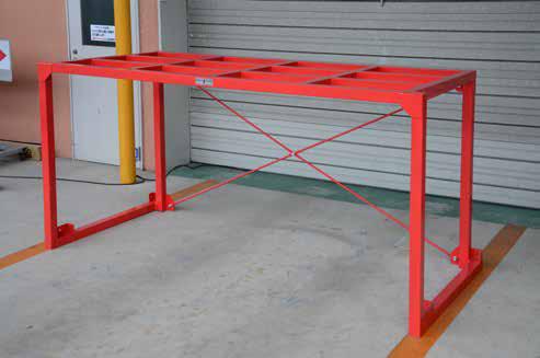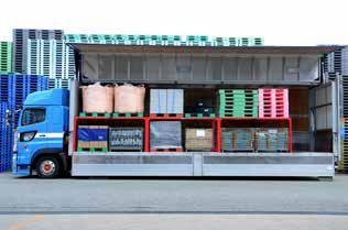 そのままでは段積みができない不定形な荷物もスペースの有効活用で積載効率がアップ。トラック荷台に2列並べて設置できる。10tトラックに最大6パレットまで設置可能。帰り便でネスティングも収納できる。