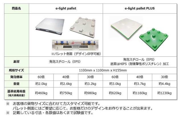 ●e-light palletのイメージ(上)、新素材パレットの仕様(下)