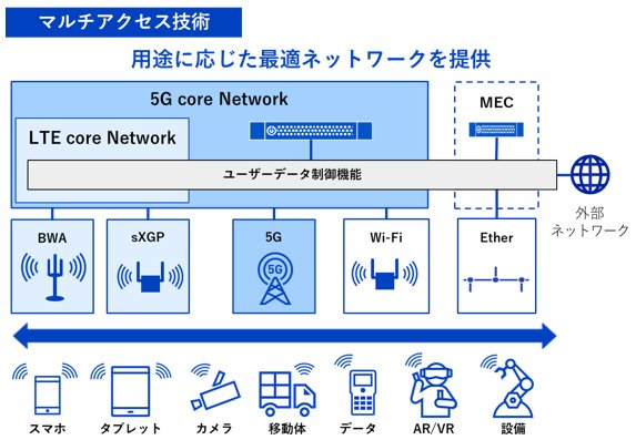同社は複数のネットワークを統合的に管理・運用する技術として、5Gコアによるマルチアクセス技術を開発しており、その第1段階として複数のPLMN-ID(携帯電話の国際的な識別番号)を認証するLTEコア(ローカルコア)を提供している。共通のLTEコアでsXGPと自営等BWA、それぞれのシステムに共通のSIMで認証することができるため、これらのネットワークの統合的な管理が可能となる。これにより、例えば屋外等の広域エリア(自営等BWA)から、屋内エリア(sXGP)への移動時においても安定した通信・通話が可能になる。