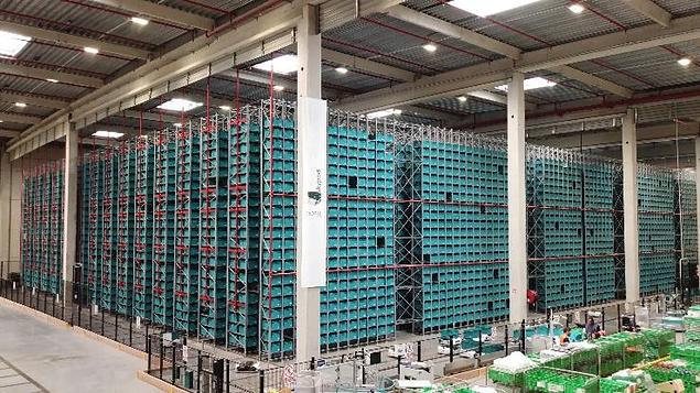 ・ラックは高さ12mまで設定可能で、通常の棚に比べ約5倍の高密度で商品を保管し、優れた入出庫能力で多数のSKUを効率よく処理する(ピッキング速度毎時最大500ビン/ステーション)