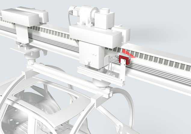 「BPS 300i」シリーズはクレーンが基軸にするレール上に施されたバーコードラベルを読みながら走行し、常時リアルタイムでシステム側に現在位置を出力。どの位置を走行していても、センサ-ラベル間の読取距離は一定を保つため、位置情報に誤差が生じず、アライメントや設置も短時間で行える。