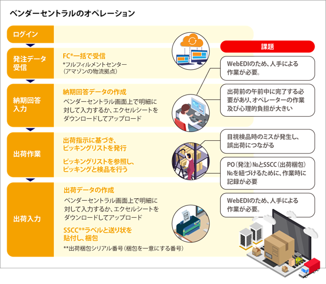 ●「ベンダーセントラル」のオペレーションと業務課題(上)、「amazingEDI」システムイメージ(下)