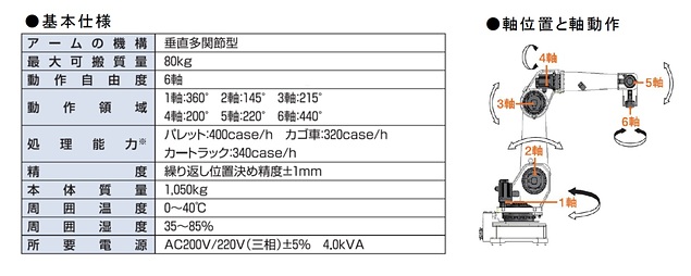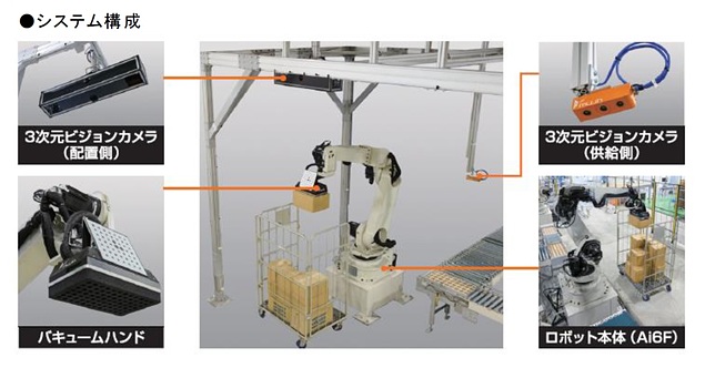 同システムはAi6F本体、ロボットハンド、2種類の3Dカメラ、AI搭載コントローラで構成。3Dカメラで読み取った情報に基づき、AI搭載コントローラが最適な積み付けパターンを自動生成し、Ai6Fがパ タ ーン通りに搬送物をカゴ車やカートラック等の運搬用什器に積み込んでいくもの。